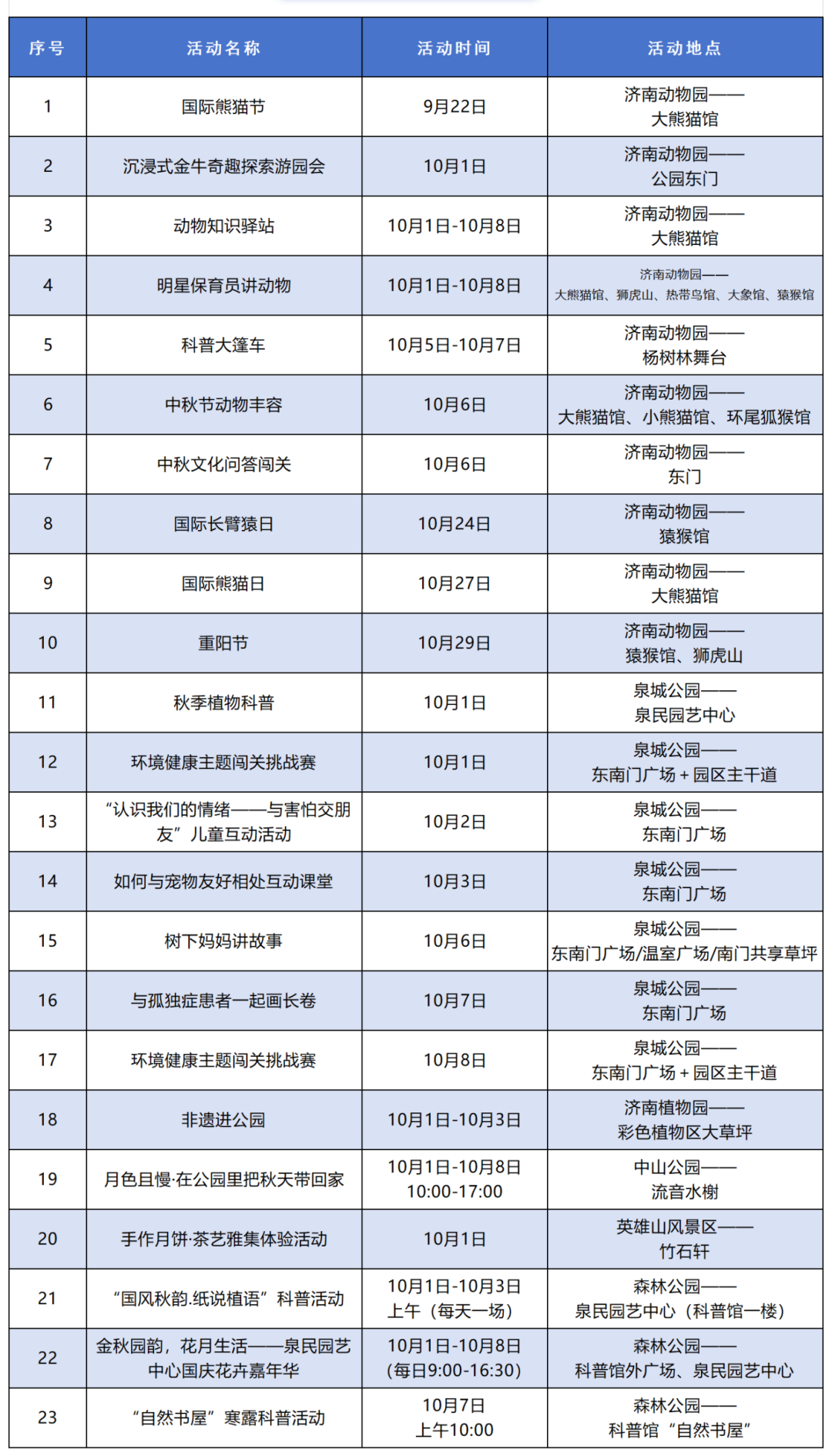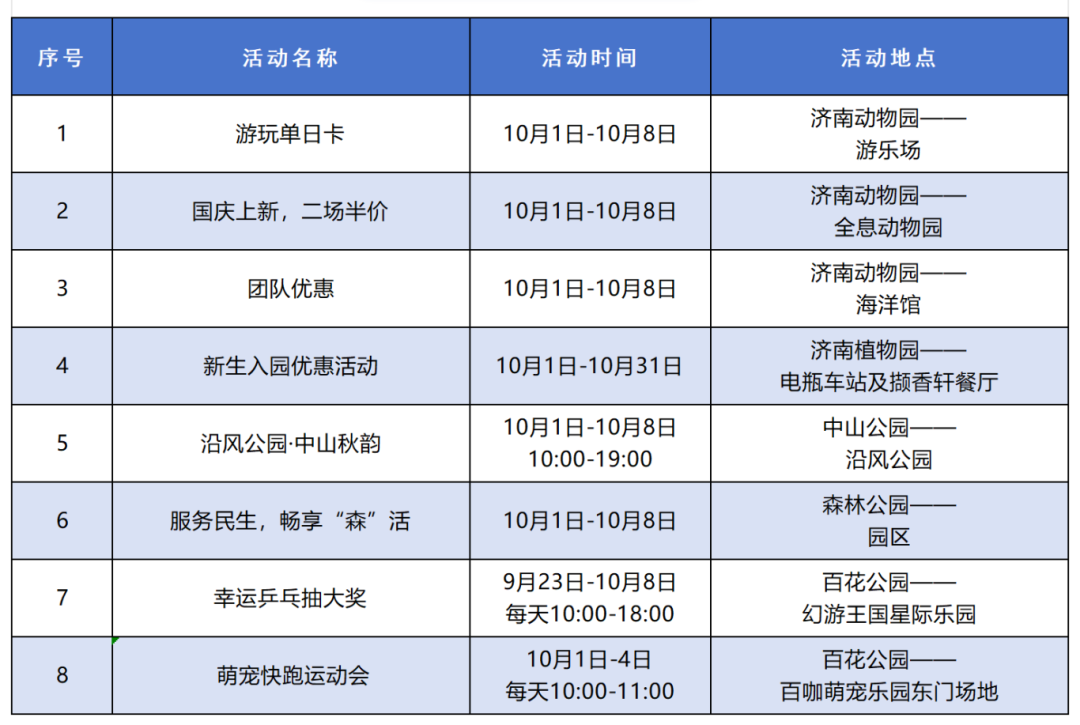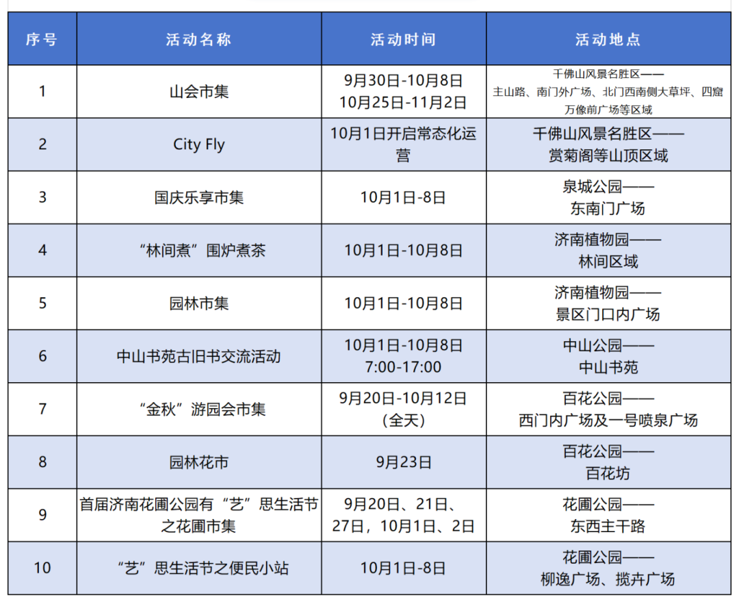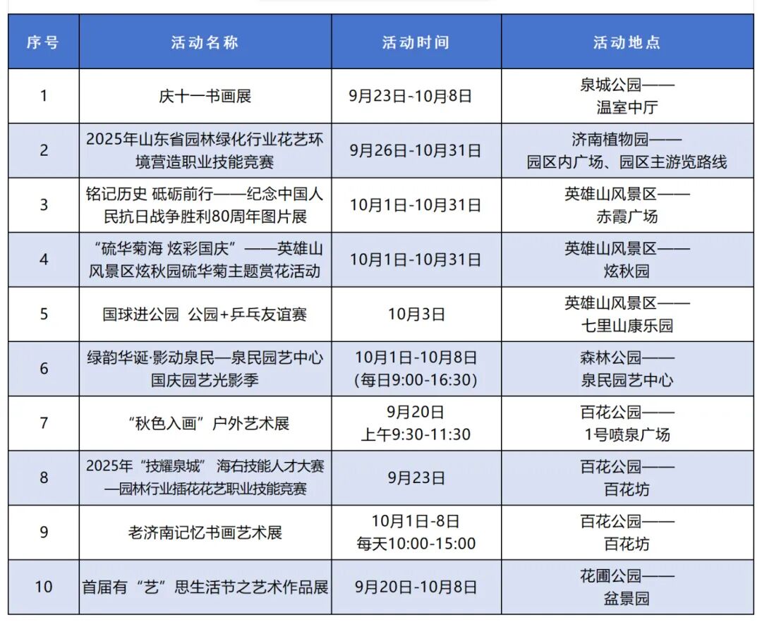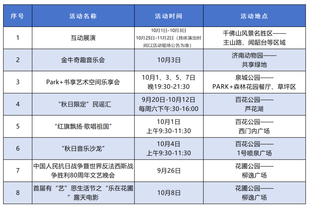 【济南公布60多项“国庆假期”活动,具体时间地点来了】据济南市公园发展服务中心消息,为丰富市民游客秋日文化生活,济南市公园发展服务中心整合千佛山风景名胜区、济南动物园、泉城公园等9个公园景区特色资源,精心策划2025“泉”在济南享金秋系列活动,为市民游客打造一场集登山健身、文化体验、市集消费、科普教育、艺术展演于一体的秋日盛宴。