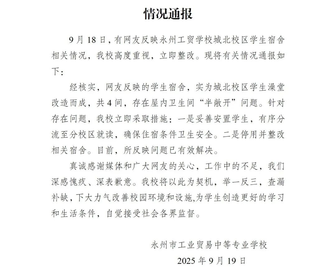 【湖南一学校通报“疑将公共厕所改成学生宿舍”】9月19日,永州市工业贸易中等专业学校发布情况通报: