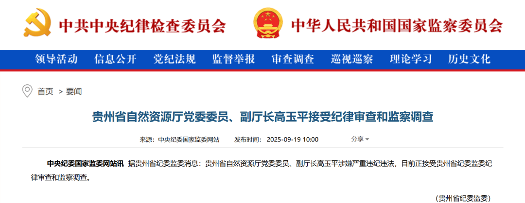 【贵州省自然资源厅副厅长高玉平被查】据贵州省纪委监委消息:贵州省自然资源厅党委委员、副厅长高玉平涉嫌严重违纪违法,目前正接受贵州省纪委监委纪律审查和监察调查。