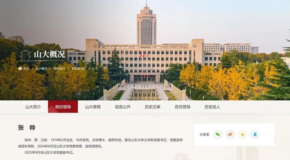 【张帅已任山东大学党委副书记】山东大学网站“现任领导”一栏近日更新显示,张帅已任山东大学党委副书记。